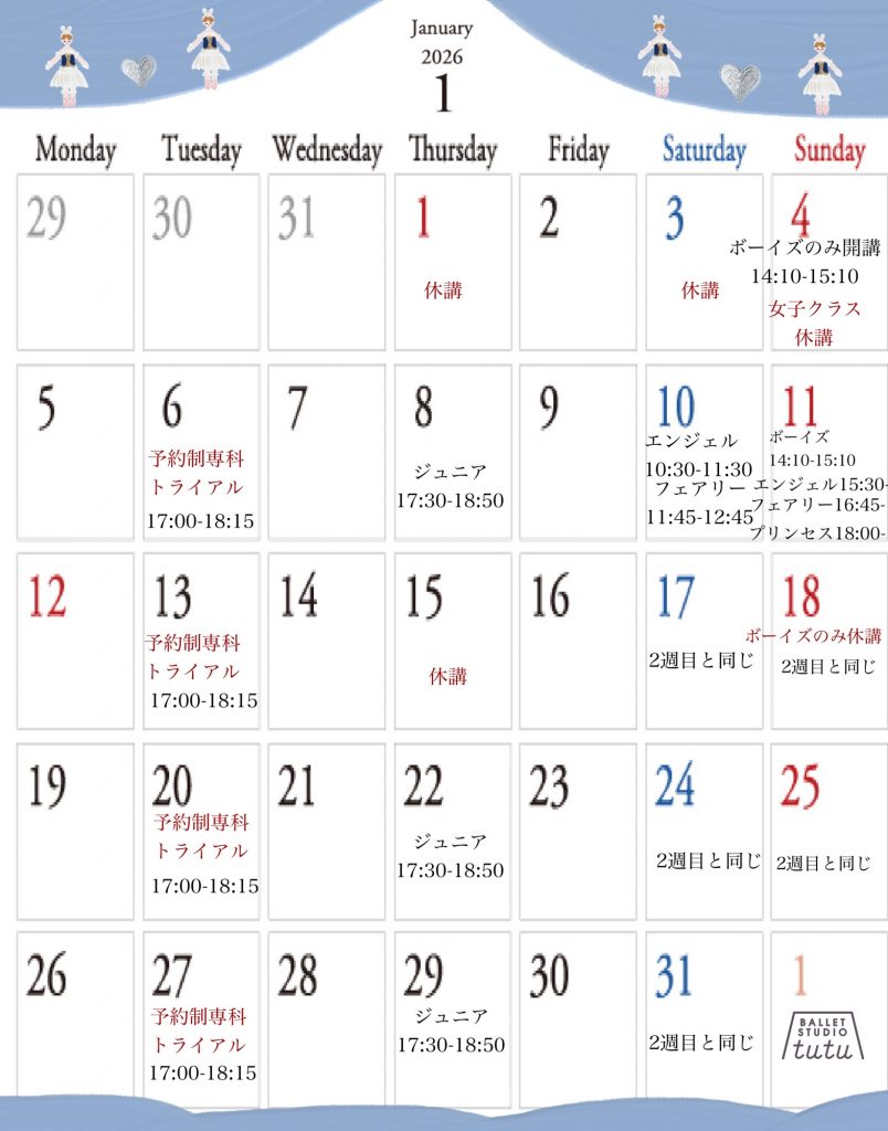 4日はボーイズクラスのみ開講。その他のクラスは2週目からtutu初めとなります✨