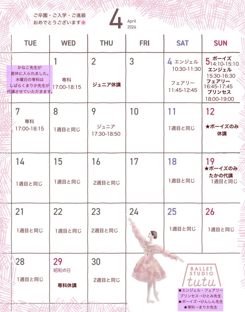 4月のスケジュールをお伝えさせていただきます。まずはキッズです🌸